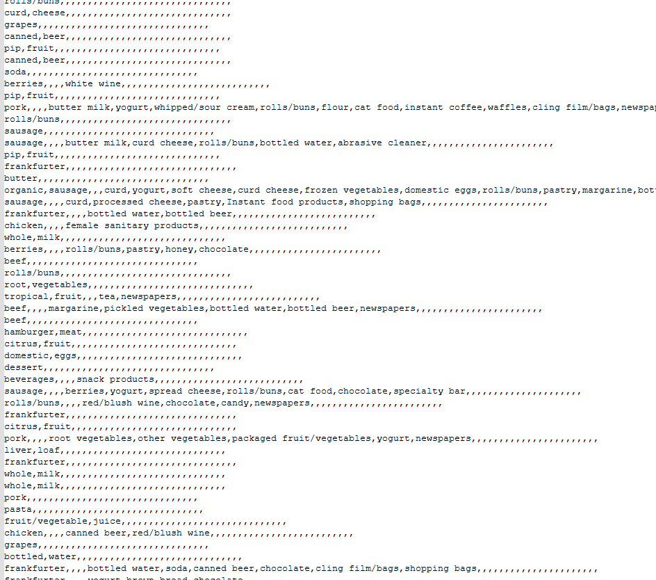 Dataset Groceries terdiri atas sekitar 9.835 transaksi dengan 169 item unik. Setiap transaksi berisi daftar barang yang dibeli oleh seorang konsumen pada satu waktu. Contoh isi transaksi: