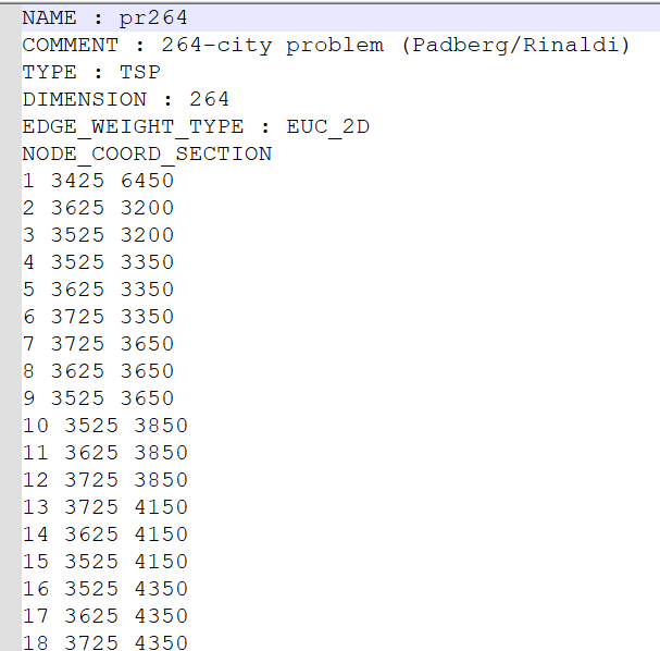 pr264.tsp: Ini adalah masalah /case dengan 264 simpul. Awalan "pr" sering dikaitkan dengan masalah dari dunia nyata, khususnya dalam bidang produksi atau perencanaan. Tipe jaraknya adalah EUC_2D (Euklidian 2D standar), menjadikannya kasus uji yang baik, berukuran sedang, dan "jujur" tanpa ada keunikan metrik yang rumit.