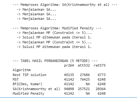 Dengan penggabungan ini, "KODE 5 ALGORITMA (TSP, BB, AG, MST, SA)" maka diharap menjadi kerangka kerja yang lebih komprehensif, mampu menjalankan dan membandingkan 7 pendekatan berbeda juga nantinya ada Pinalty Search dan Tabu CW, dari yang pasti dan deterministik hingga yang bersifat heuristik dan proProgresilistik