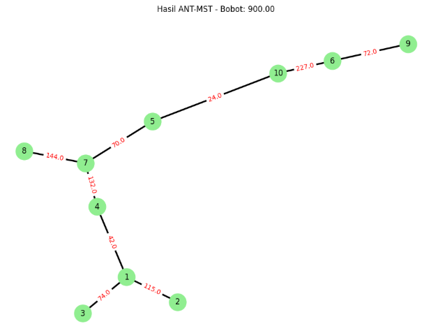 >> ANT-MST Berhenti: Solusi konvergen setelah 10 iterasi tanpa perbaikan.