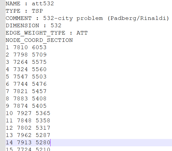 att532.tsp: Problem dengan 532 simpul ini sangat populer karena keunikannya. Tipe jaraknya adalah ATT, sebuah fungsi "pseudo-Euclidean" yang dimodifikasi. Jaraknya dihitung menggunakan rumus yang melibatkan faktor pembagi sqrt10. Menggunakan att532 adalah cara yang sangat baik untuk menguji apakah sebuah algoritma dapat menangani fungsi jarak non-standar dan tidak hanya terpaku pada metrik Euklidian biasa.