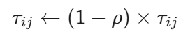 - Penguapan Feromon (Evaporation): Semua feromon pada setiap edge dikurangi dengan