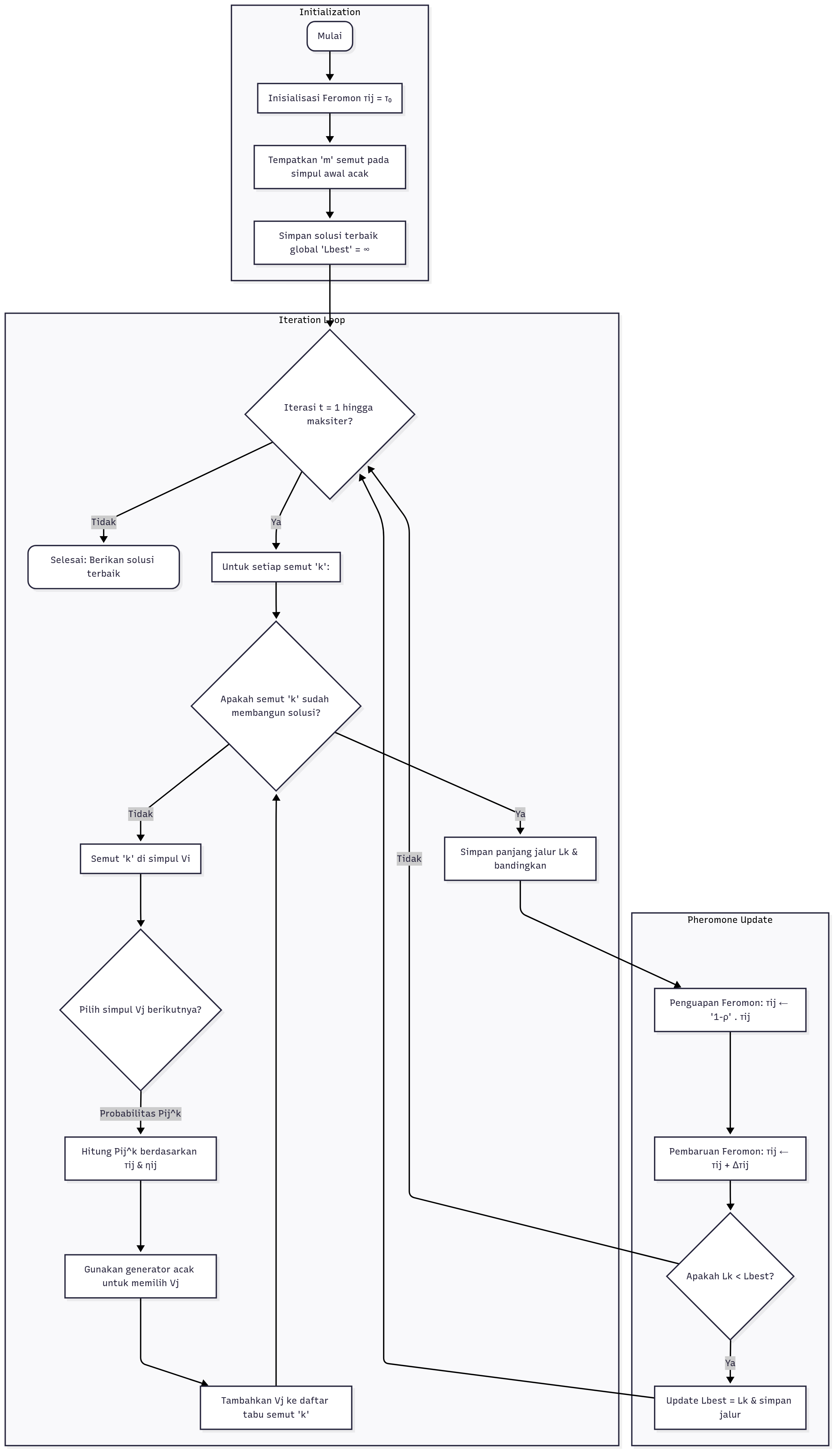 Algoritma Ant Colony Optimization (ACO) bekerja melalui serangkaian langkah yang berulang (iterasi) untuk menemukan jalur optimal dalam sebuah graph. Berikut adalah alur kerja lengkapnya.